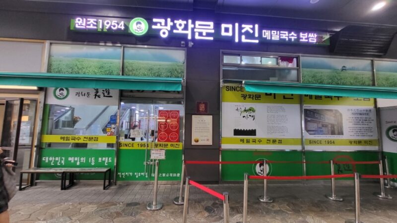 종로 일대엔 오래된 식당이 많지만, 광화문 미진은 그중에서도 간판이 주는 인상이 꽤 세요. 초록색 차양 아래 광화문 미진 메밀국수가 크게 걸려 있고, 입구 앞엔 기다리는 사람을 세우는 동선이 따로 보입니다. 굳이 안으로 들어가기 전부터 “아, 여긴 그냥 지나가다 비는 자리 있으면 들어가는 집은 아니구나” 싶은 마음이 먼저 생겨요.